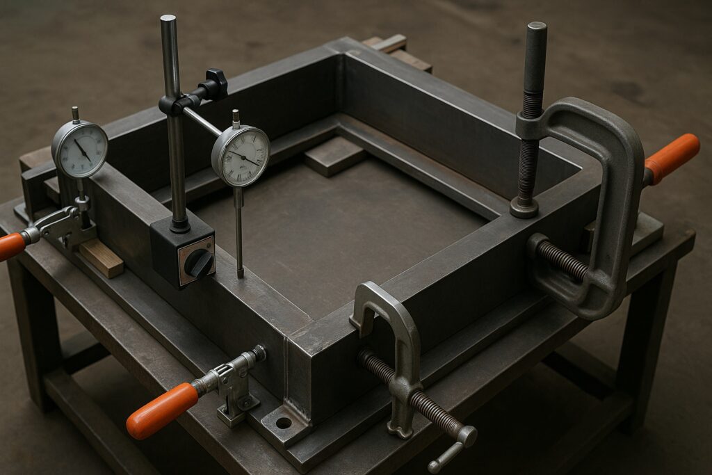 Сначала разметьте контрольные точки, привяжите их к постоянным базам оснастки и замерьте фактическое положение: линейка-эталон, щупы, индикатор на стойке, контроль диагоналей. Форму нужно закрепить так, чтобы опоры «держали» размеры, но не вносили перекос. Для длинных плоскостей применяют траверсы, дистанционные подкладки, прижимные планки с регулируемым усилием. В узких местах ставят шаблоны — стальные рейки или кондукторы, фиксирующие зазор и параллельность.